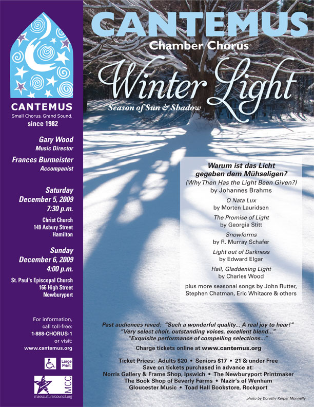 You will also hear works by another Canadian composer, Stephen Chatman, as we sing his “Blow, Blow Thou Winter Wind.” You may recall that Cantemus performed his “There is Sweet Music Here,” for chorus and oboe, last spring. Today’s work is based on the classic and well-known text by William Shakespeare, wherein he describes winter as “not so unkind as man’s ingratitude” and that “most friendship is feigning, most loving mere folly” — yet another metaphorical link of winter beyond its stark darkness.