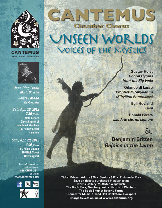Today’s program, Unseen Worlds, offers a musical glimpse into this mystery of all mysteries: mysticism. In a Newsweek article, April 13, 1998, 47% of Christians said they had personally experienced the Holy Spirit. Could Hildegard von Bingen have suffered from migraines and their effects? Could St. John of the Cross have suffered with severe depression? Could St. Teresa of Avila been faking it? Does it matter whether she was a psychotic or a saint? Could chloroform and mescaline and nitrous oxide be responsible for mystical altered states? Perhaps, in the end, it is more about the effects of these experiences than the stimuli. The music we offer you is a reflection of these experiences – mystical texts, thoughts, principles set to music. We give you a wide spectrum of possibilities through choral color, sound and idea.