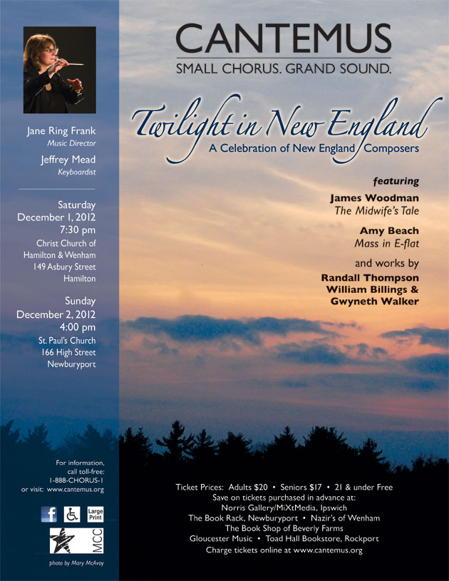 Twilight in New England celebrates this new energy mixed with a kind of sweet nostalgia by re-visiting some of New England’s most esteemed historical composers and highlighting some contemporary stars: William Billings, Randall Thompson, Amy Beach, James Woodman, Gwyneth Walker. The word twilight is defined as “the light from the sky between sunset and full night produced by diffusion of sunlight through the atmosphere and its dust.” This program is an ode to that magical dusty light that falls over the region’s skies, lakes, forests and ocean.