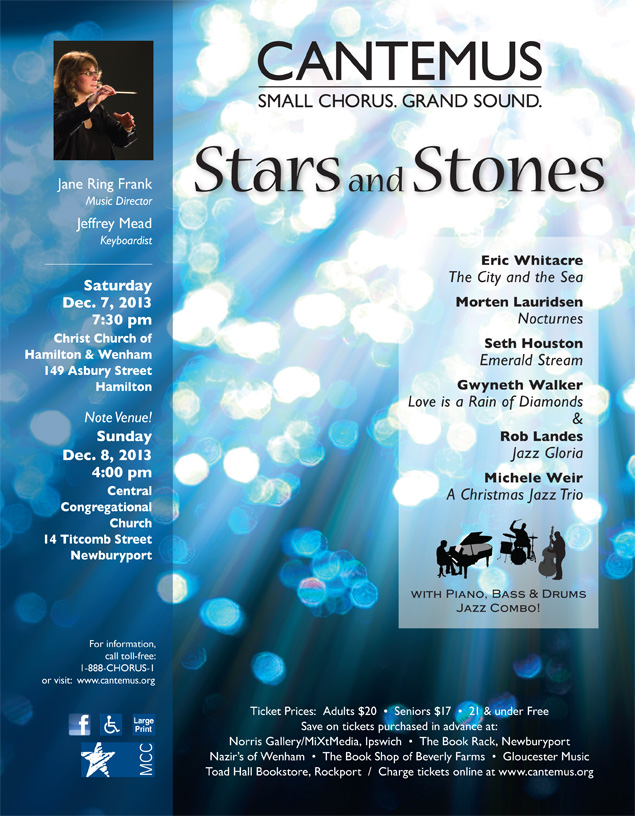 A title inspired by those sparklers of both the heavens and the earth: stars and stones. Heads in the clouds; feet on the ground. A universe in balance. “Each a reflected soul mate, an echo in the cosmos.” Dazzling stars are the obvious choice — the jewels of a black winter sky, if you will — and can be found in Lauridsen’s stunning setting of James Agee’s poem “Sure on This Shining Night.” (Sure on this shining night/I weep for wonder/Wand’ring far alone/Of shadows on the stars.) And stones — the jewels of a frozen earth. These natural gems can be found in a number of pieces on the program. You will hear us sing of emeralds, of pearls, of smooth stones, of diamonds. (“Love is a rain of diamonds in the mind/a fruit of the soul sliced in two.”)